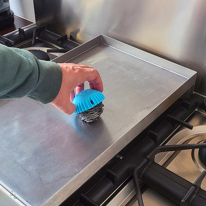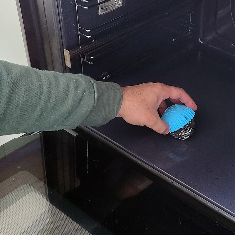 SCRUBBALL est également parfait pour nettoyer les éclaboussures de four brûlées avec un peu d’eau.