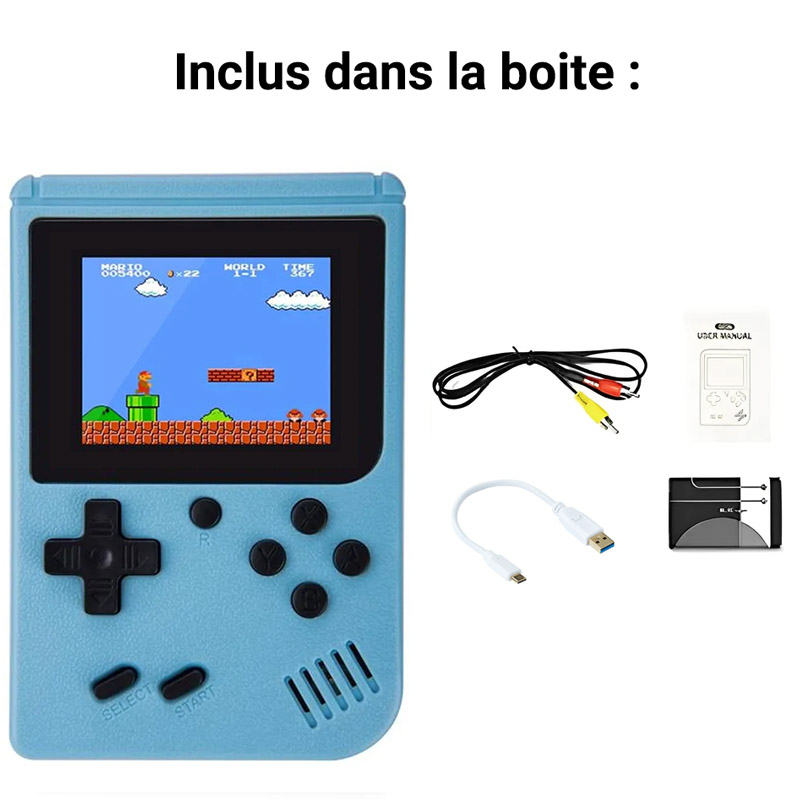 - Câbles inclus: 1x câble AV (Prise en charge de la connexion TV) + 1x câble USB (Rechargement de la console) + Manette pour 2ème joueurs avec câble.