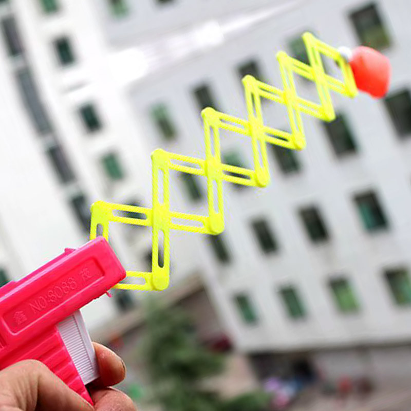 Aucune inquiétude, ce pistolet ludique est inoffensif! Il n’a pas de balle mais seulement un poing télescopique qui s’étend quand on appuie sur la gâchette.